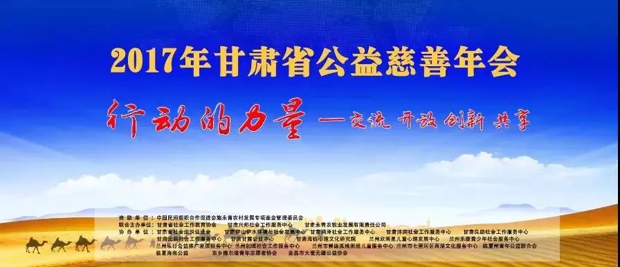 12月30日,由甘肃兴邦社会工作服务中心、甘肃省社会工作教育协会、甘肃永青农牧业发展有限责任公司联合主办、全省18家公益慈善组织、社会服务机构共同协办的2017年甘肃省公益慈善年会在兰州市成功举办。本次年会以“行动的力量——交流 开放 创新 共享”为主题,来自民政、残联、共青团、全省十四个市州的198家社会组织和全国各地的8家基金会参加了此次年会。甘肃甘露公益中心&西部爱心公益社也很荣幸的应邀参加了这次年会,热烈恭贺此次年会圆满结束。